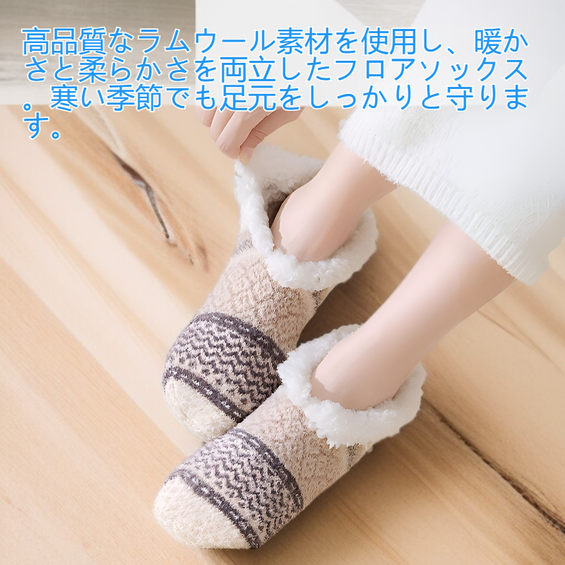● 高品質なラムウール素材を使用し、暖かさと柔らかさを両立したフロアソックス。寒い季節でも足元をしっかりと守ります。